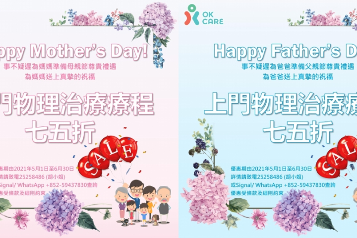 母親節及父親節優惠:物理治療服務七五折!